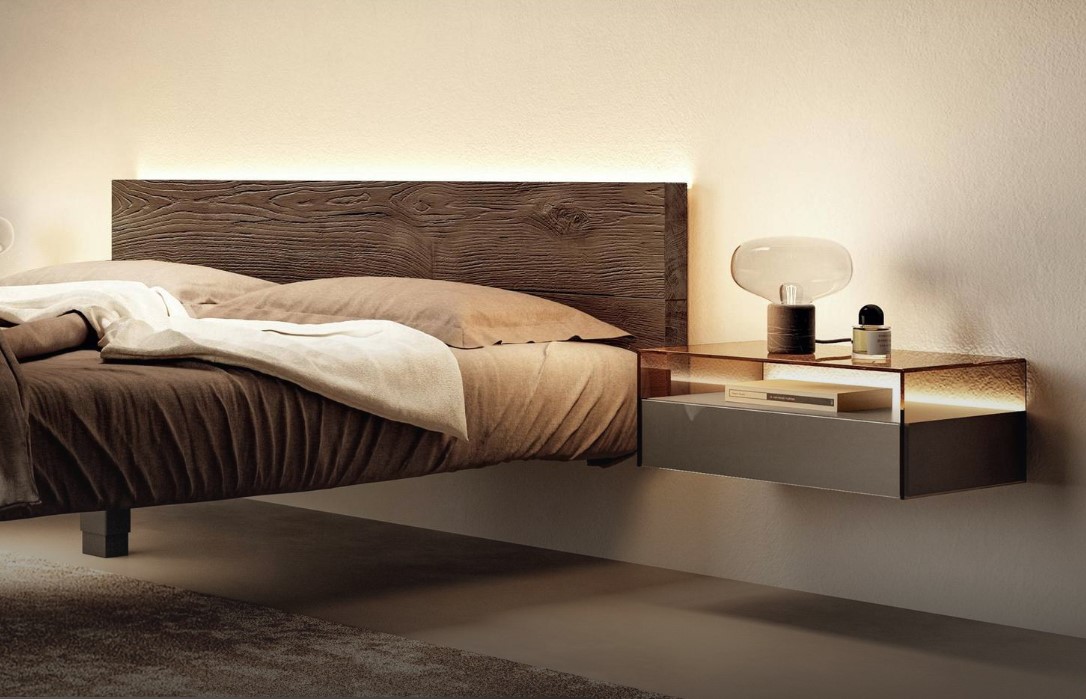Cama con cabezal en madera de Roble envejecido y madera maciza de la marca Lago Design.