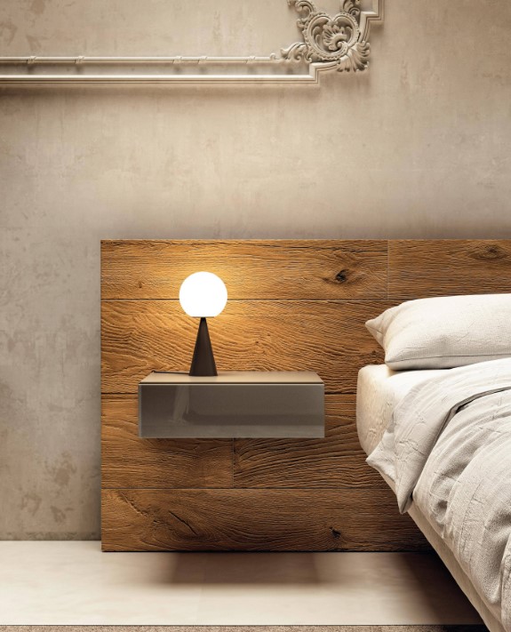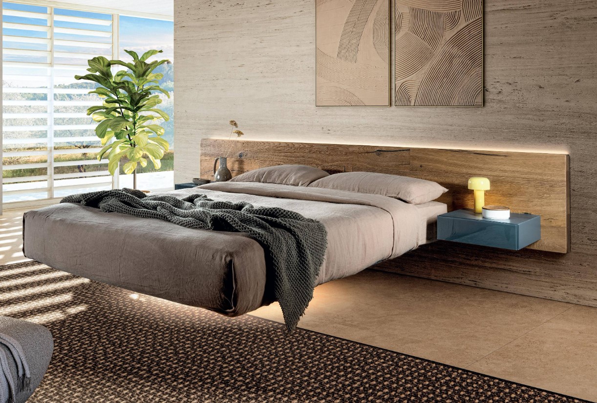 Cama con cabezal en madera de Roble envejecido y madera maciza de la marca Lago Design.