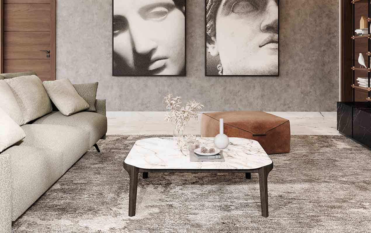 Mesa auxiliar de centro/café con base de madera en tono a elegir y tapa cerámico a elegir