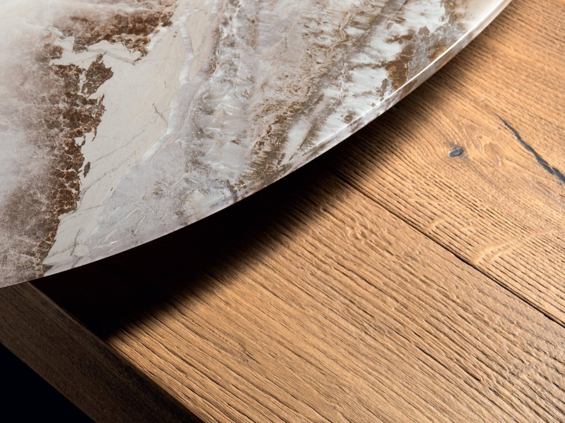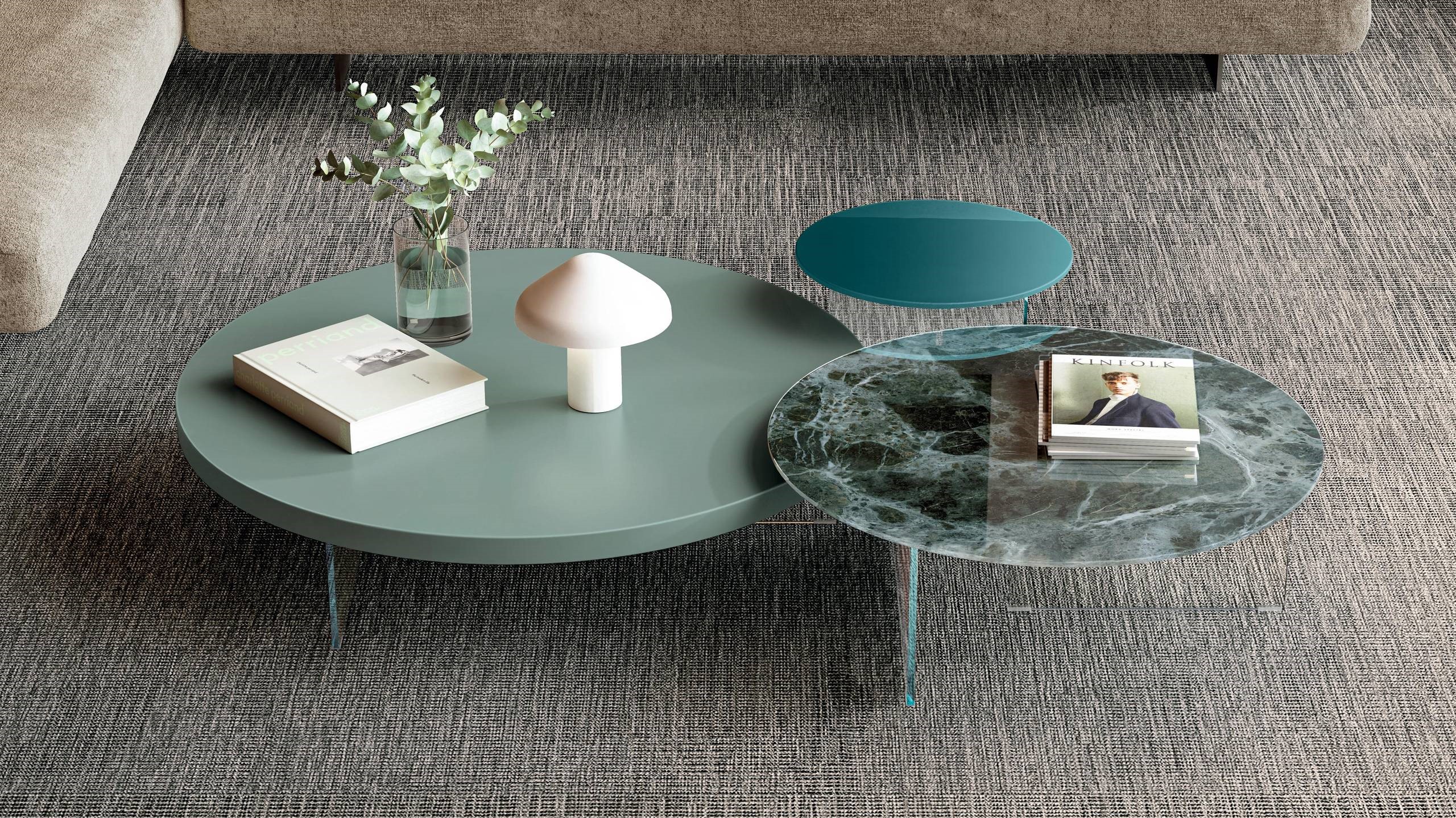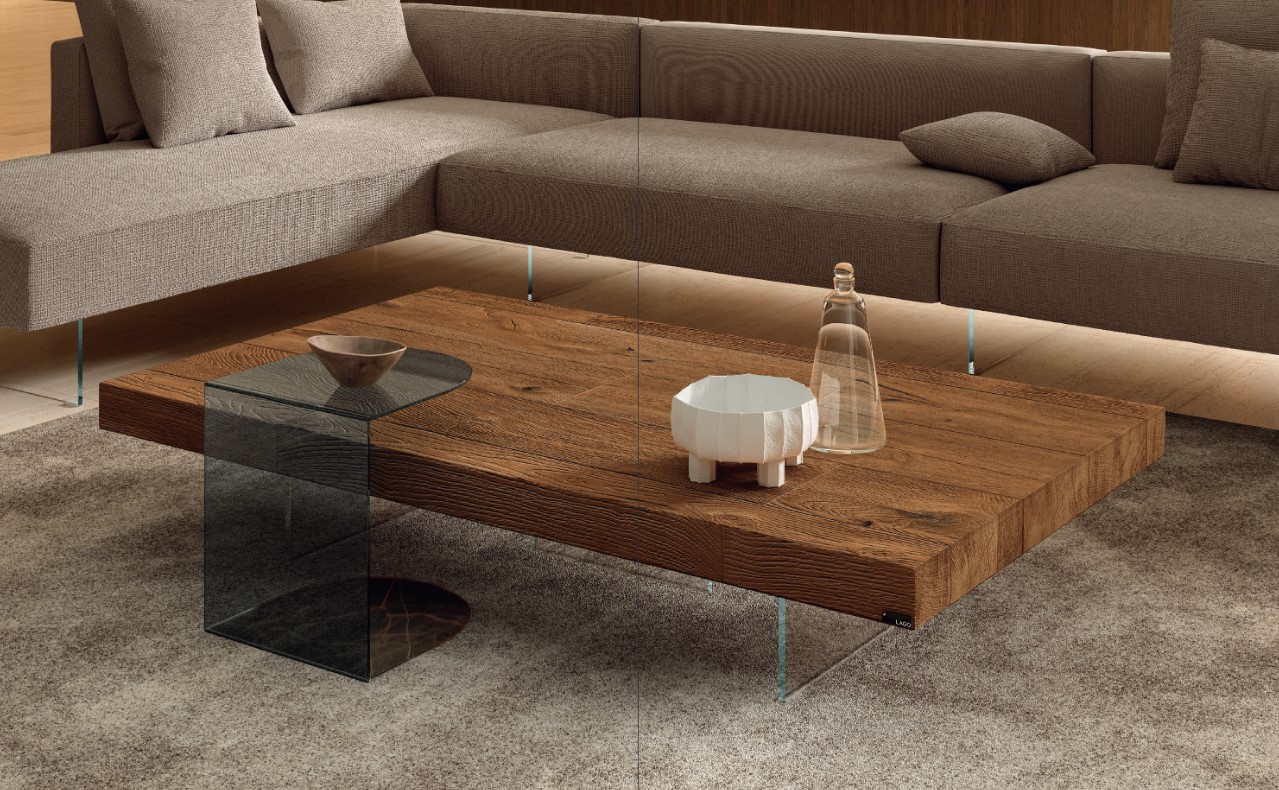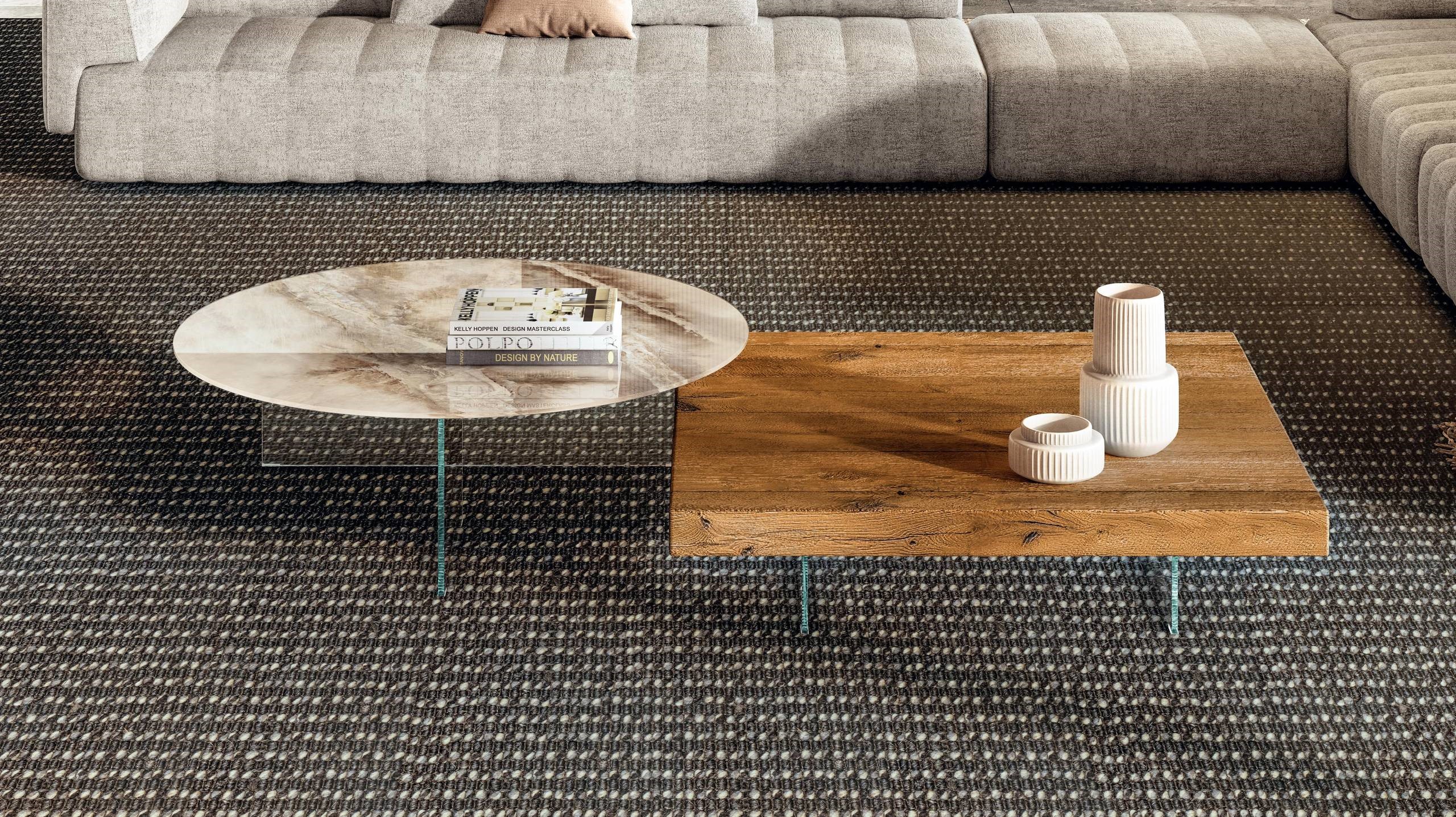 Mesa auxiliar de centro/café con base de cristal en acabado a elegir entre extraclaro,fumé gris,fumé bronce.Tapa/Encimera en material cristal brillo o mate con diferentes y variados acabados lisos,marmolados,metalizados,etc a elegir de nuestro muestrario de materiales físico en exposición.Marca Lago.