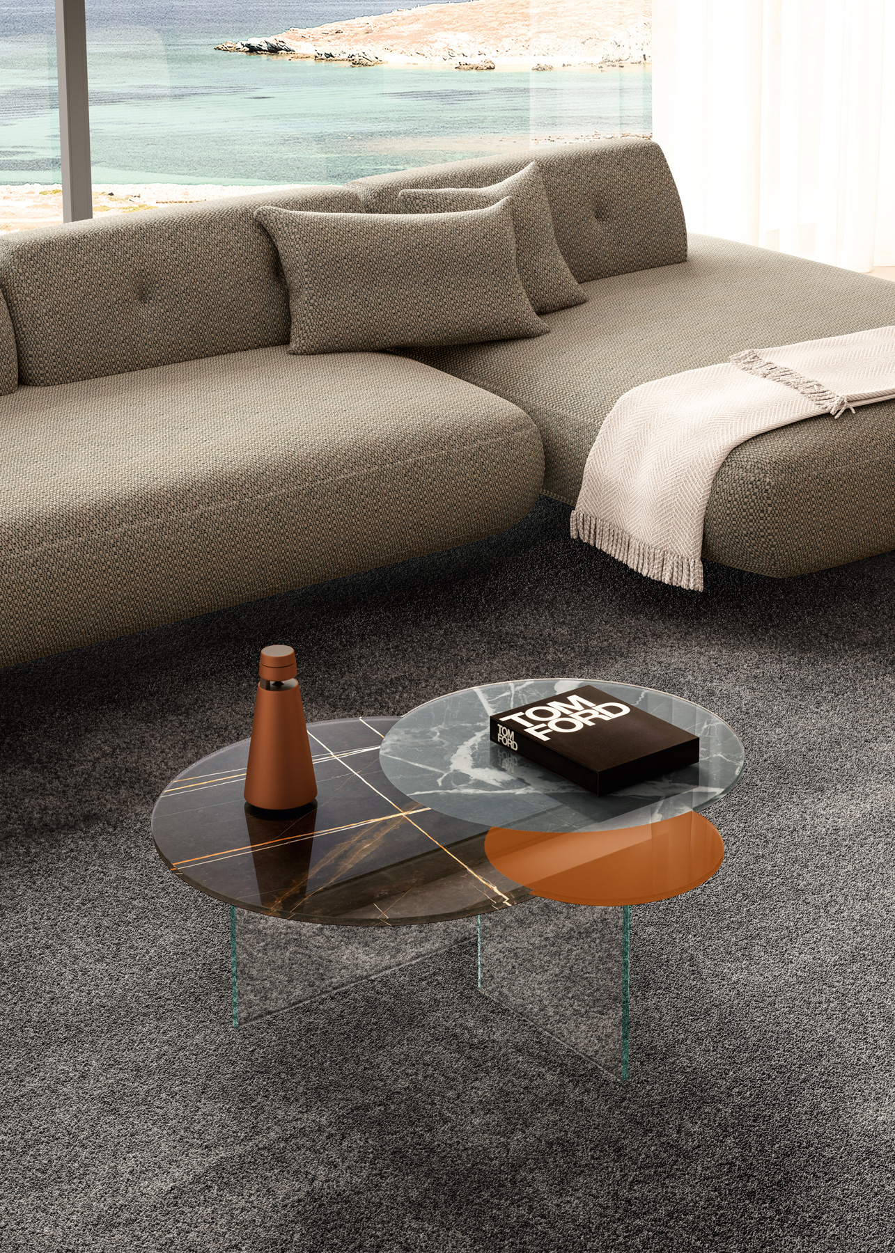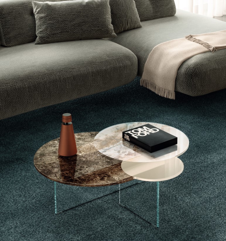 Mesa auxiliar de centro/café con base de cristal en acabado a elegir entre extraclaro,fumé gris,fumé bronce.Tapa/Encimera en material cristal brillo o mate con diferentes y variados acabados lisos,marmolados,metalizados,etc a elegir de nuestro muestrario de materiales físico en exposición.Marca Lago.