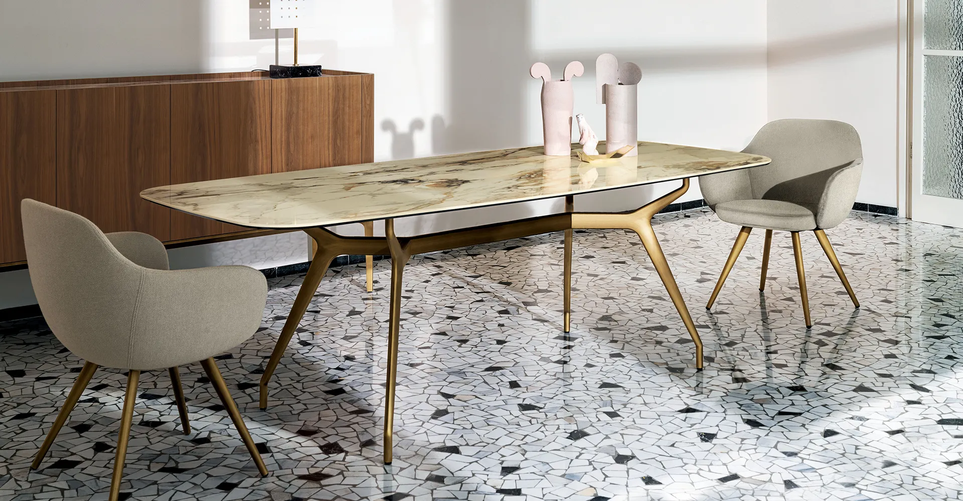 Mesa de comedor con base en metal en 8 acabados .Tapa/Encimera en maderas,lacados,cristales lisos o marmolados, brillo o mate con diferentes y variados acabados a elegir de nuestro muestrario de materiales físico en exposición.