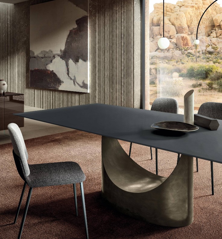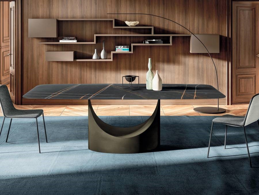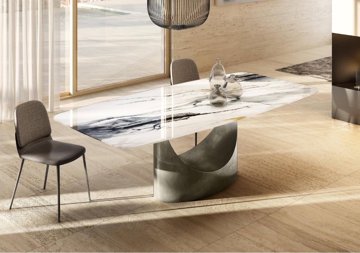 Mesa de comedor con base acero pintado o maderas .Tapa/Encimera en maderas,marmoles,cristales lisos o marmolados,brillo o mate y porcelánicos con diferentes y variados acabados a elegir de nuestro muestrario de materiales físico en exposición.