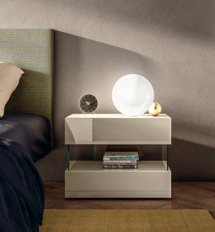 Mesita de noche 2 cajónes con enmarcado de cristal extraclaro,gris fumé o bronce y en acabados del cajón en cristal marmolado brillo o mate ,en lacados o cristales lisos en todo el colorido a elegir del muestrario de Lago.Consultar.