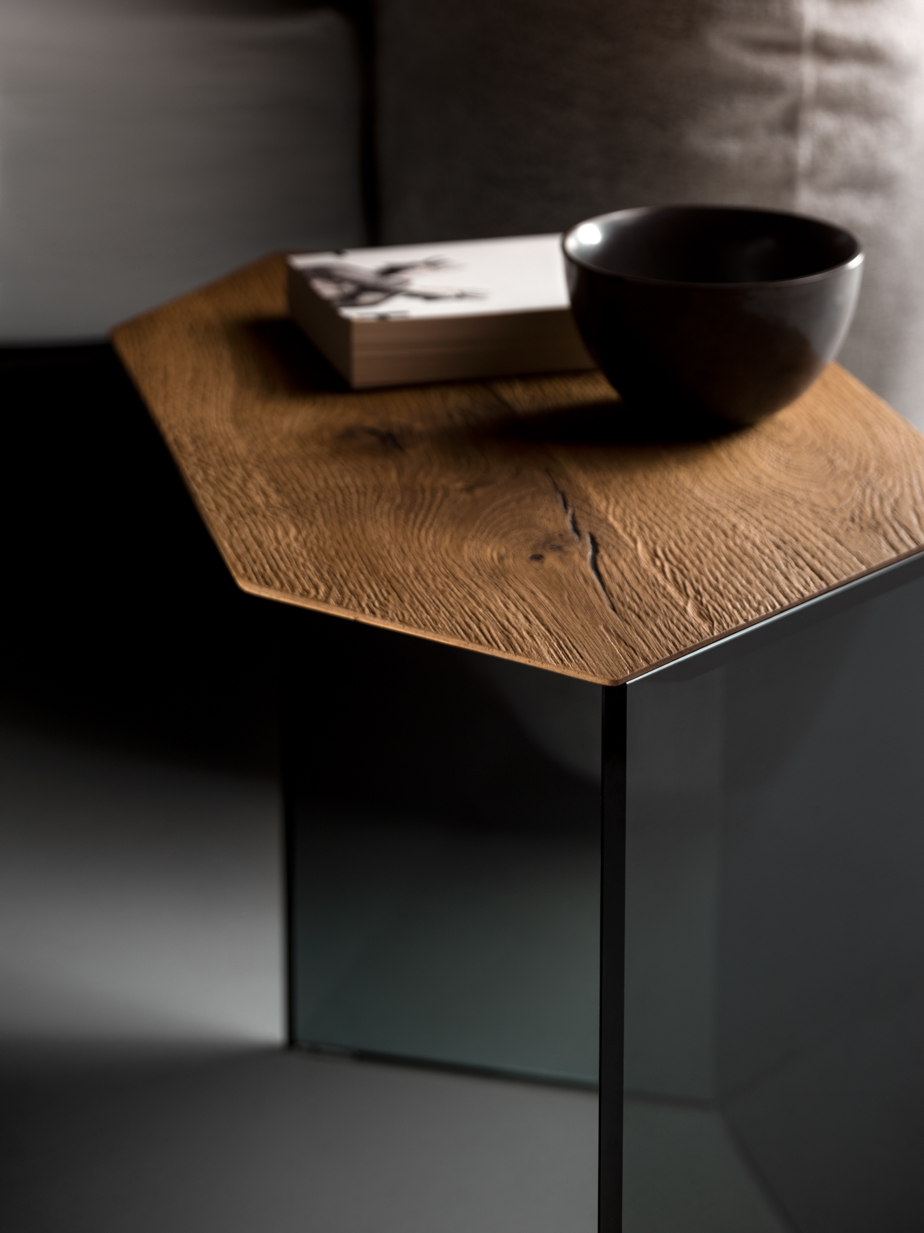 Mesita de noche cristal y madera.Marca LAGO. Consúltanos.