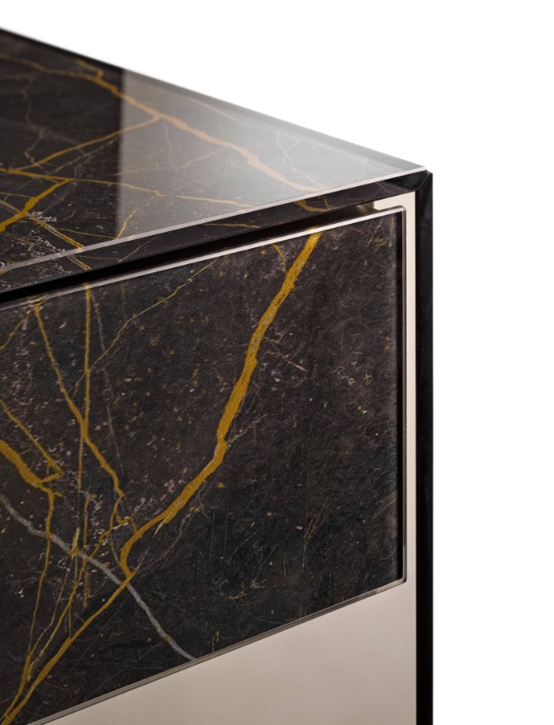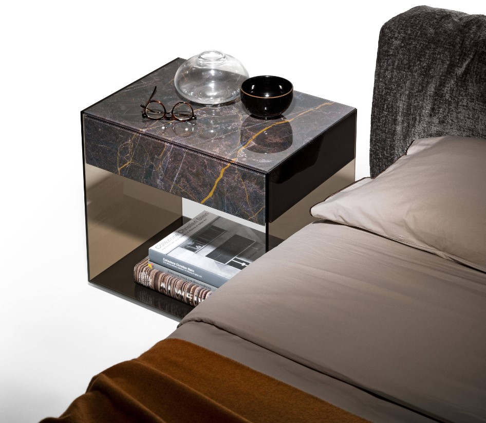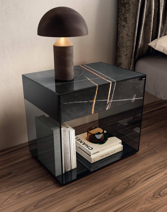 Mesita de noche 1 cajón con enmarcado de cristal extraclaro,gris fumé o bronce y en acabados del cajón en cristal marmolado brillo o mate ,en lacados o cristales lisos en todo el colorido a elegir del muestrario de Lago.Consultar.