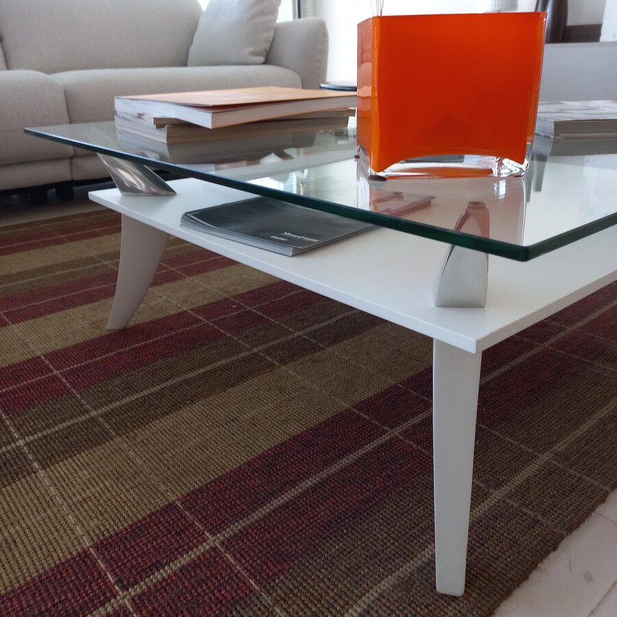 Mesa de centro 100×100.Sobre cristal transparente y revistero con estructura en laca mate.